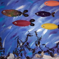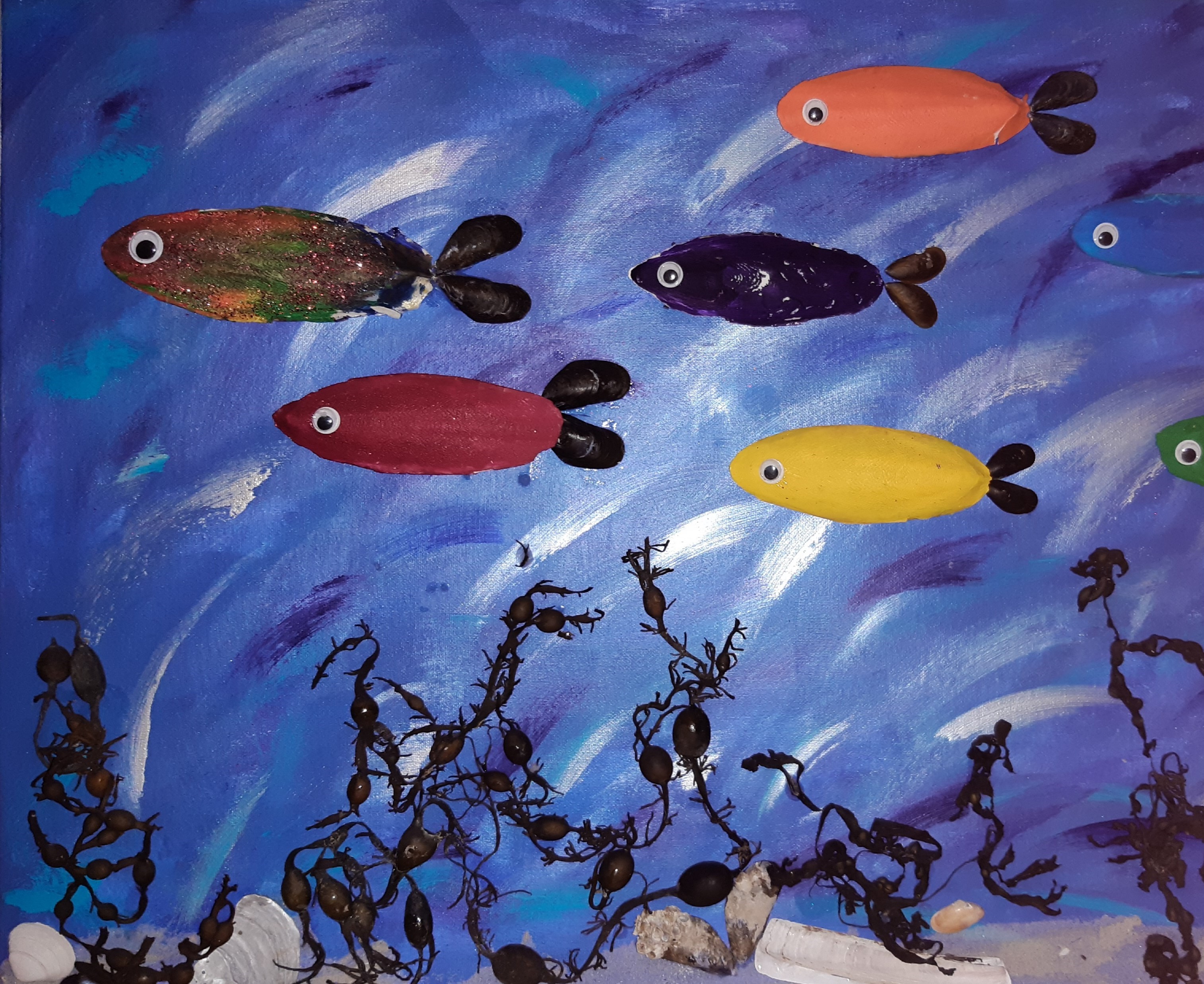 Bovenstaand schilderij is naar het kinderboek De mooiste vis van de zee in co-creatie van mijn dochter Anne en mij ontstaan in de periode dat ik me de kunst van het stilstaan eigen maakte.